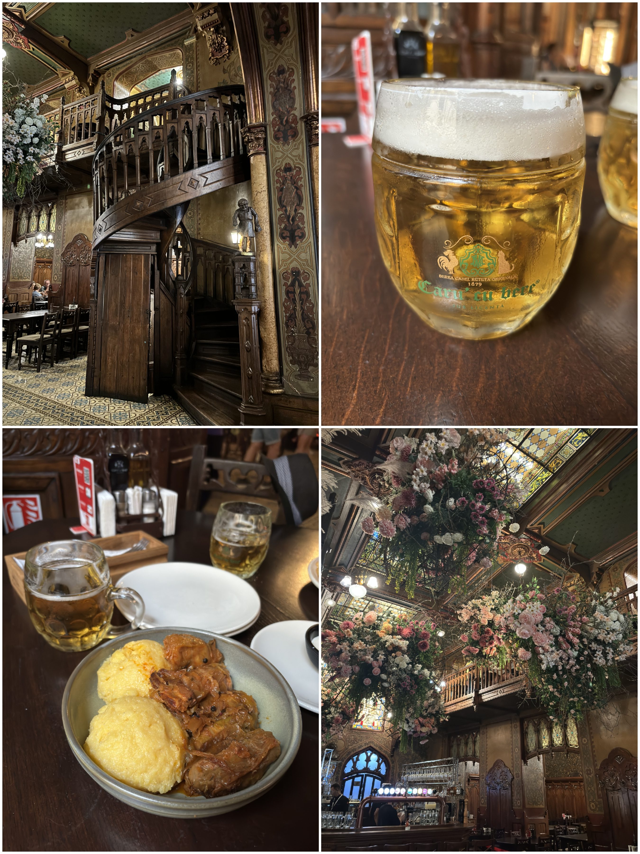 Večer jsme zakončily výběrem jedné ze tří vyhlášených místních restaurací s rumunskou kuchyní. Vyrazily jsme si vybrat podle menu, recenzí a jak to vypadá. Jedna se nám vůbec nelíbila a nakonec jsme skončily v té nejvyhlášenější restauraci Caru‘ cu bere. Asi to byla ta nejlepší volba. Zvolila jsem místní Sarmale. Je to nejtypičtější rumunský pokrm. Jde o mleté maso (nejčastěji vepřové v kombinaci s drůbežím či jehněčím) smíchané s rýží, cibulí a kořením, zabalené do zelných listů a vařené. V některých částech Rumunska se místo zelných listů používají vinné listy. Často podáváno s polentou. K pití jsme zvolily místní pivo a asi to nebyla úplně dobrá volba. Mělo to takový podivný ocas. A nechutnalo ani bratrům ze Slovenska, na letišti jsme se shodly, že Plznička je Plznička, ihned si tam koupili dvě láhve. 😂