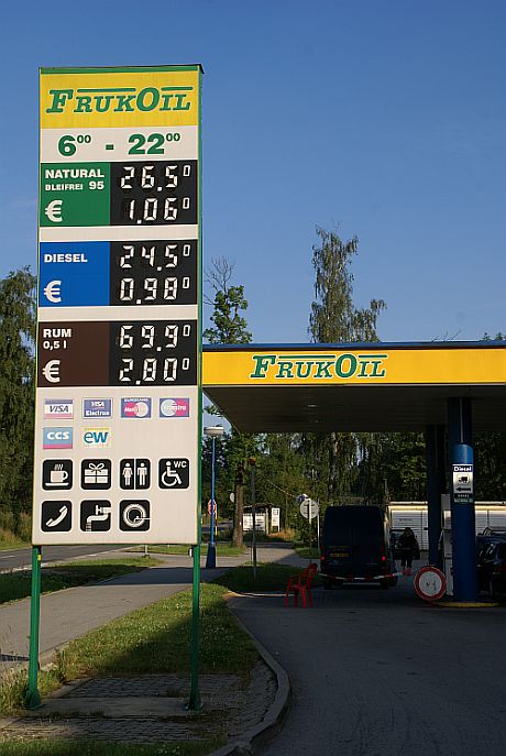 Nebo se nestíháte zastavit ve městě a potřebujete jen natankovat váš vůz? V tom případě Frukoil je jasnou volbou. Kromě pohoných hmot na ceduli naleznete i rum 😂.
