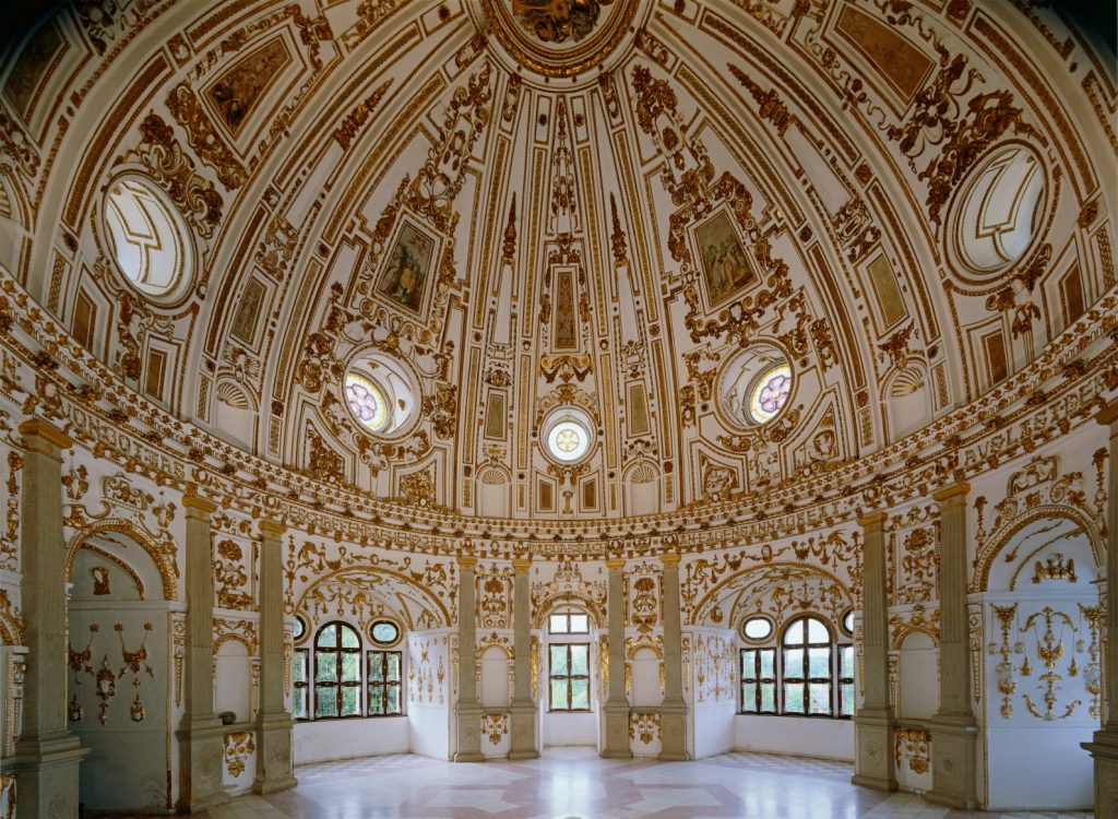 V kopuli spatřujeme především postavy andělů různých velikostí, které často drží ve svých rukou hudební nástroje. Jsou zde také lidské postavy hudebníků a dále rozmanité polo-postavy a tváře pohledných nebo krásných rysů. Mimoto se v kopuli objevují další mytologické nebo obecně nadpozemské motivy, a vše doplňuje množství zlacených linií, lístků, rozvilin, květů a girland. Zdobné motivy v kopuli jednoznačně připomínají ráj, zatímco motivy na stěnách pod římsou tvoří postavy podivných pitvorných stvoření. Dále vidíme nespočetné množství různě velkých fantaskních obličejů.